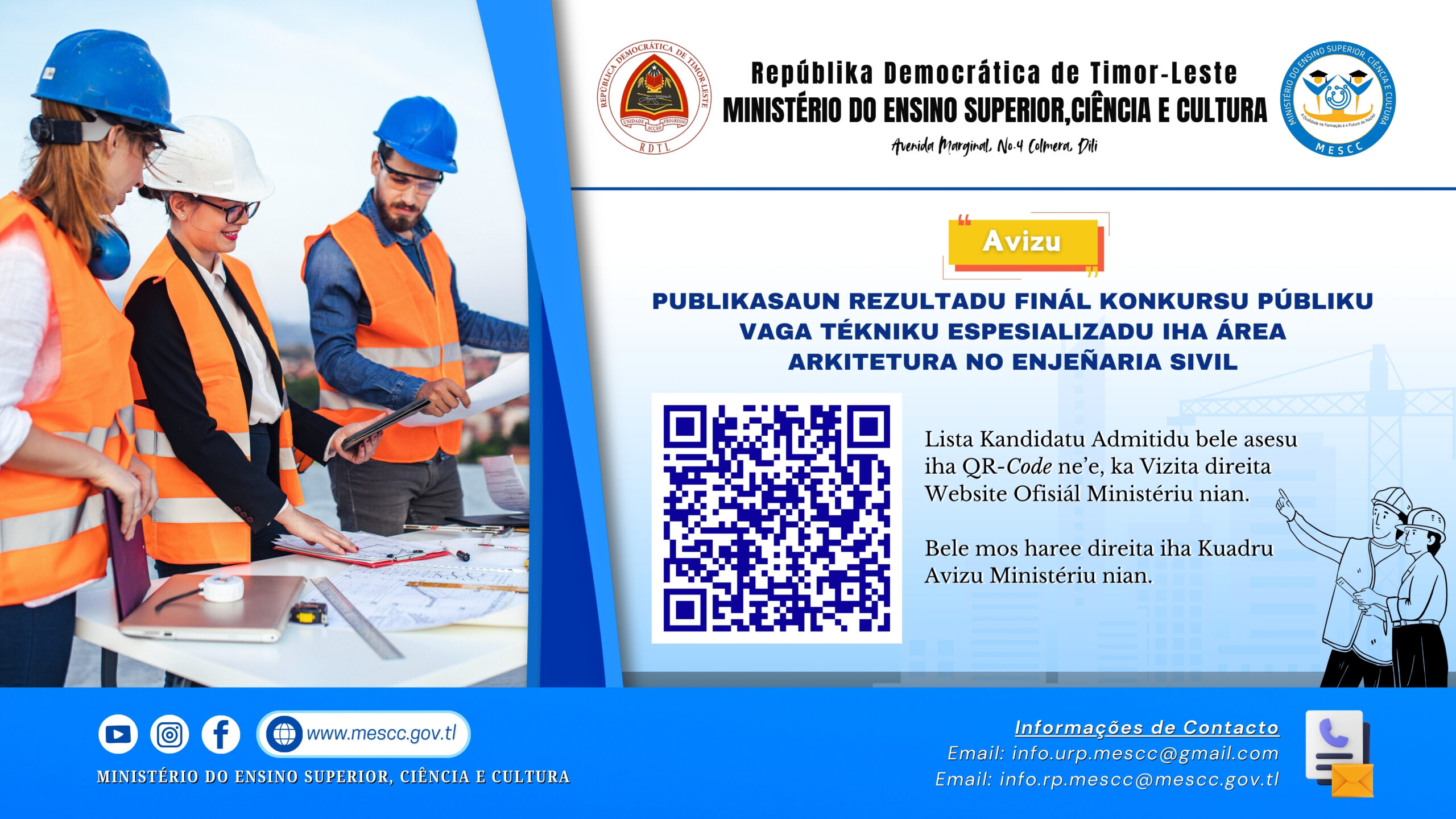 Ministériu Ensino Superior, Siénsia no Kultura, liu husi Diresaun Nasionál Rekursu Umanu, Públika rezultadu finál ba Konkursu Públiku vaga Tékniku Espesializadu àrea Enjeñaria Sivil no Arkitetura ne’ebé maka tuir ona prova orál/entrevista iha data 17 to’o 19 fulan Fevereiru 2025. Husu ba Kandidatu ne’ebé maka pasa ona iha Konkursu públiku ne’e atu apreznta-an iha Diresaun…