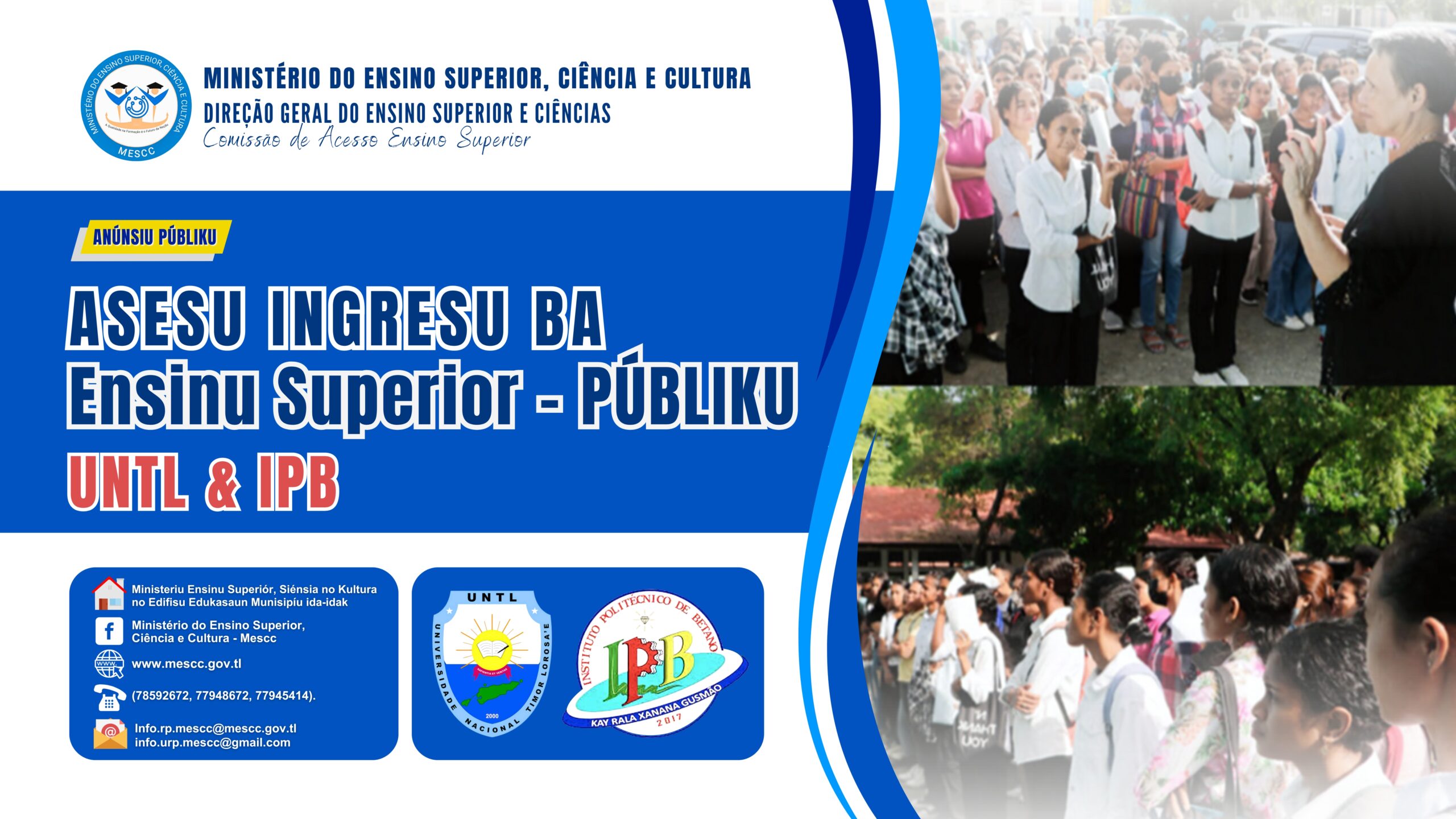 Ministériu Ensinu Superior, Siensia no Kultura (MESSK), liu husi Diresaun Nasionál Aprovizonamentu (DNA) hakarak informa ba kompaña sira ne’ebé mak elijibél no iha interese atu fornese servisu ne’ebé mak temi hanesan tuir mai: No Nú. Ref Item ba Projetu Fatin foti Dokumentu 1 28/SBK/DNA-DNPF/MESCC/X/2025 Akizasaun Ekipamentus Informatika Díli, DNA-MESCC Bele mai foti konvite no cadernos…