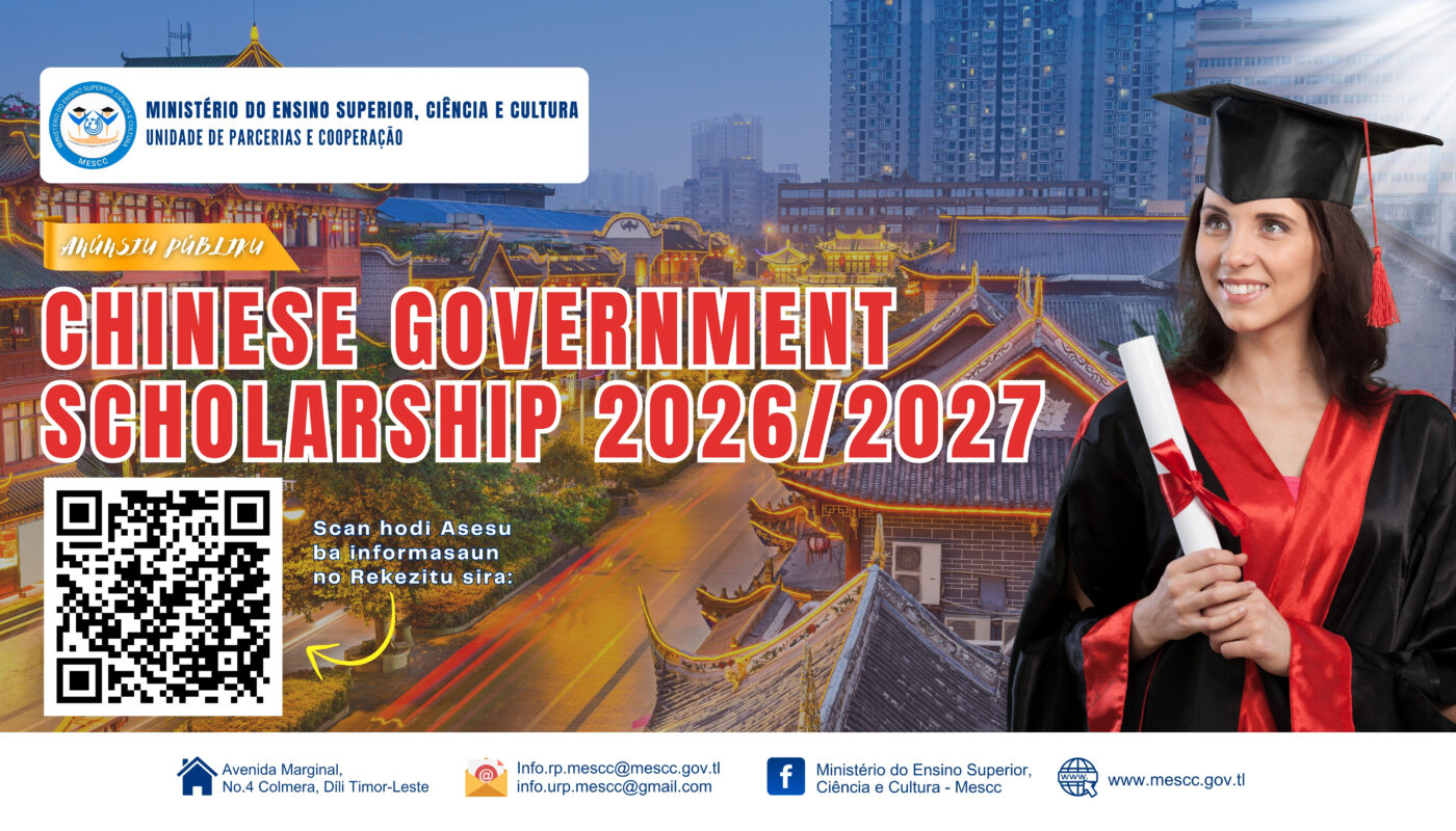Ministério do Ensino Superior, Ciência e Cultura (MESCC) liu husi Unidade de Parceria e Cooperação (UPC) informa ba públiku katak Governu Republika Populár China liu husi Chinese Government Scholarships (CGS) for Academic Years 2026/2027 oferese bolsu estudu kompletu ba Timor oan nain rua nulu (20) atu kontinua estudu iha Instituisaun ensinu superiór ka akadémia peskiza nian iha nasaun China, ho programa nível Lisensiatura (S1), nível Mestradu (S2), nível Doutoramentu (S3), General Scholar Program no mos Senior scholar program.