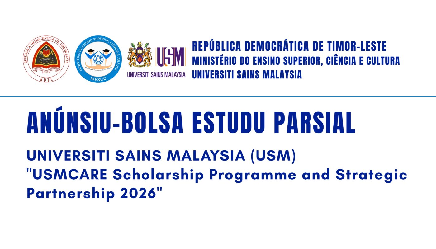 Ministério do Ensino Superior, Ciência e Cultura (MESCC), liu hosi Unidade de Parceria e Cooperação (UPC) informa ba públiku katak Universiti Sains Malaysia (USM) liu hosi programa “USMCARE Scholarship Programme and Strategic Partnership 2026” oferese Bolsu Estudu Parsial ba Timor oan nain rua (2) hodi kontinua estudu ba iha nível Doutoramentu, iha universidade refere.