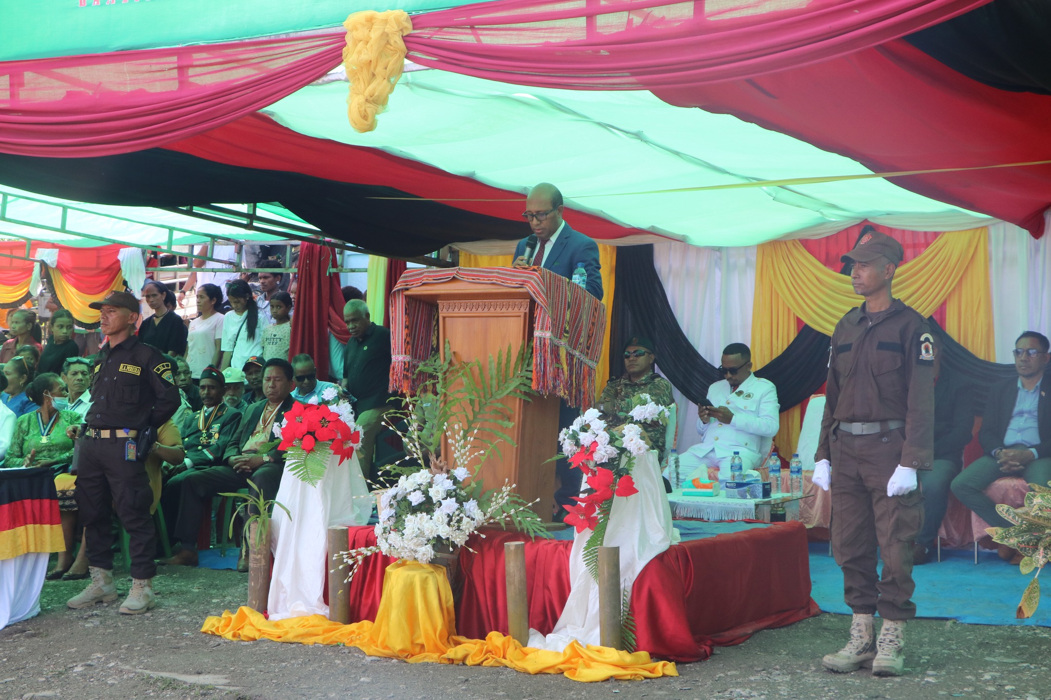 Laga, 28/11/2024: Diretor Jeral Planeamentu no Finansa MESSK, Sr. Hernâni Viterbo da Costa Soares, akompañadu husi Administrador Posto Laga, Sr. João Freitas de Castro, lidera serimónia Isar bandeira nasional ba selebrasuan loron nasional proklamasaun Independinsia RDTL ba dala 49, iha Suku Soba, Posto administrativo Laga, Munisipiu Baucao. Iha sesaun serimónia ofisial ida ne’e, Diretor Jeral…