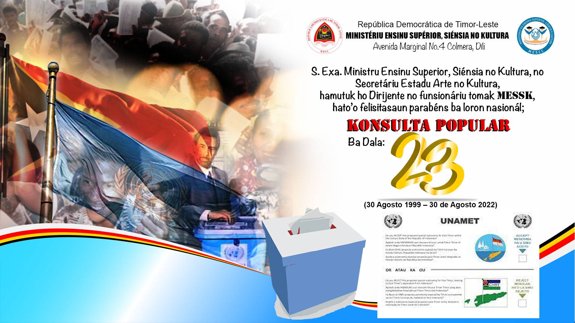 S. Exa. Ministru Ensinu Superiór, Siénsia no Kultura, no Sekretáriu Estadu Arte no Kultura hamutuk ho Dirijente no Funsionáriu tomak MESSK, hato’o felisitasaun parabéns ba loron nasionál; KONSULTA POPULAR ba dala: 23