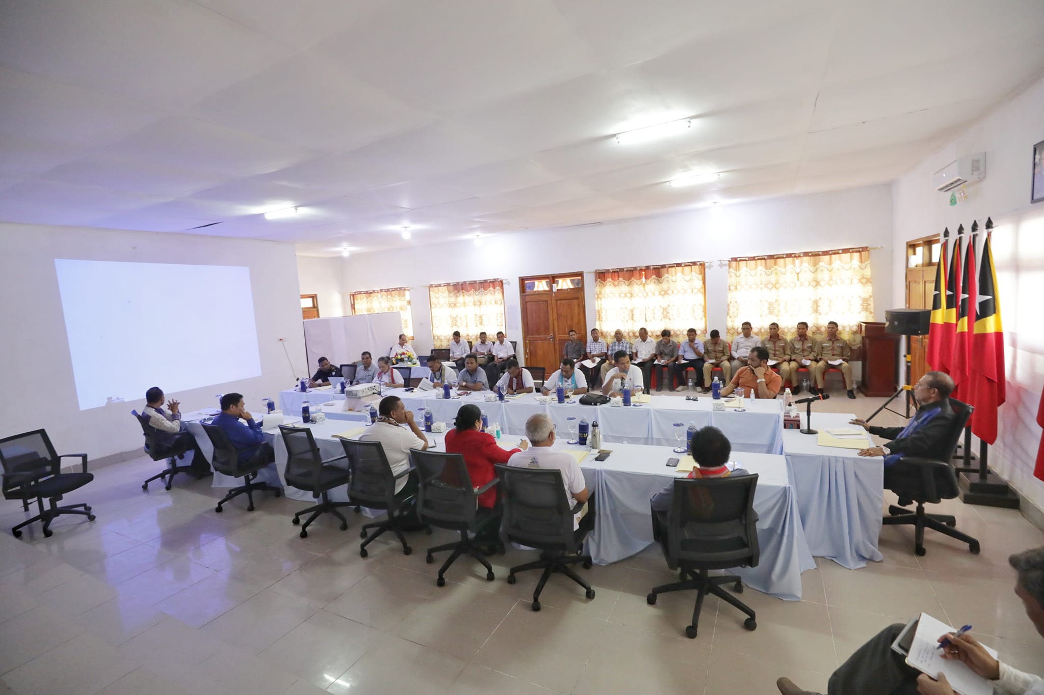 S. Exa. Ministru Ensinu Superiór, Siensia no Kultura, Longuinhos dos Santos, hamutuk ho Membru Governu balun akompaña S. Exa. Primeiru Ministru hala’o sorumutuk ho Autoridade sira husi Munisipiu AtaúroSoromutuk ne’e hala’o iha salaun Administrasaun Sentral Ataúro, no partisipa iha sorumutuk ne’e mak Administrador Munisipiu no Xefi Suku sira.