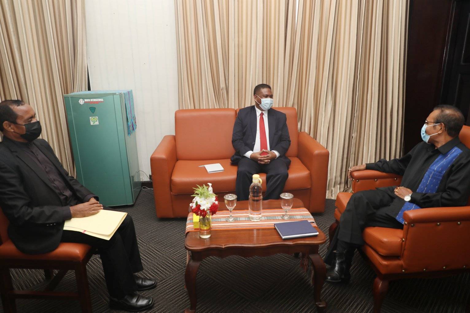S. Exa. Ministru Ensinu Superior, Siénsia no Kultura, Longuinhos dos Santos akompaña husi S. Exa. Sekretáriu Estadu Arte no Kultura, Teófilo Caldas hala’o audiénsia ho S. Exa. Primeiru-Ministru, Taur Matan Ruak, iha Palácio do Governo, hodi koalia kona-ba asuntu relasiona ho área ensinu superiór no kultura.