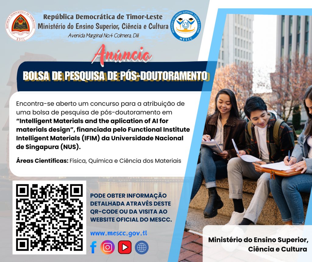 Aberto o concurso para atribuição  de uma bolsa de pesquisa de pós-doutorado  em Intelligent Materials and the aplication of AI for materials design, financiada  pelo Functional Institute Intelligent Materials (IFIM)-National University of Singapore(NUS) no âmbito das seguintescondições: Tipo e Número de Bolsa a atribuir: Uma bolsa de Pós-Doutorado  a todos os Timorenses para continuaram os …