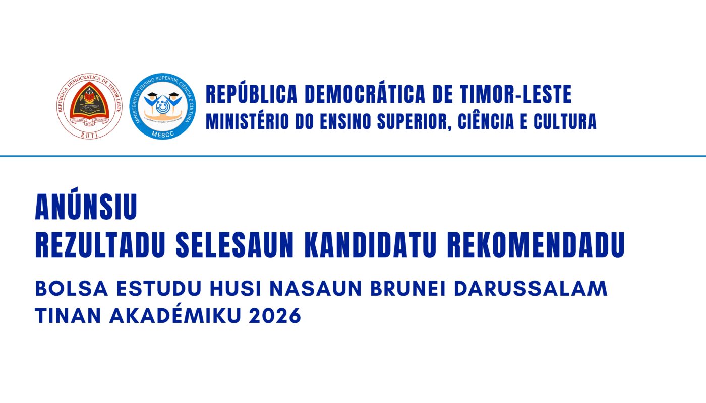 Bazeia ba Intrevista Prezensiál selesaun bolsa nian ne’ebé hala’o iha loron 19 Janeiru 2026 no mos bazeia ba Despaxu Aprovasaun hosi Sua Exelensia Ministro do Einsino Superior, Ciência e Cultura nian ba ofísiu 22/UPC-MESCC/I/2026, iha loron 21 Janeiru 2026, mak Ministério do Ensino Superior, Ciência e Cultura (MESCC) liu hosi Unidade de Parcerias e Cooperação (UPC) hakarak informa ba kandidatu programa “The Government of Brunei Darussalam Scholarship to Foreign Students Tenable in Brunei Darnssalam 2026/2027 Academic Session” nian katak rezultadu Selesaun Faze Intrevista hodi hetan kandidatu Rekomendadu ba bolsu estudu refere mak hanesan :